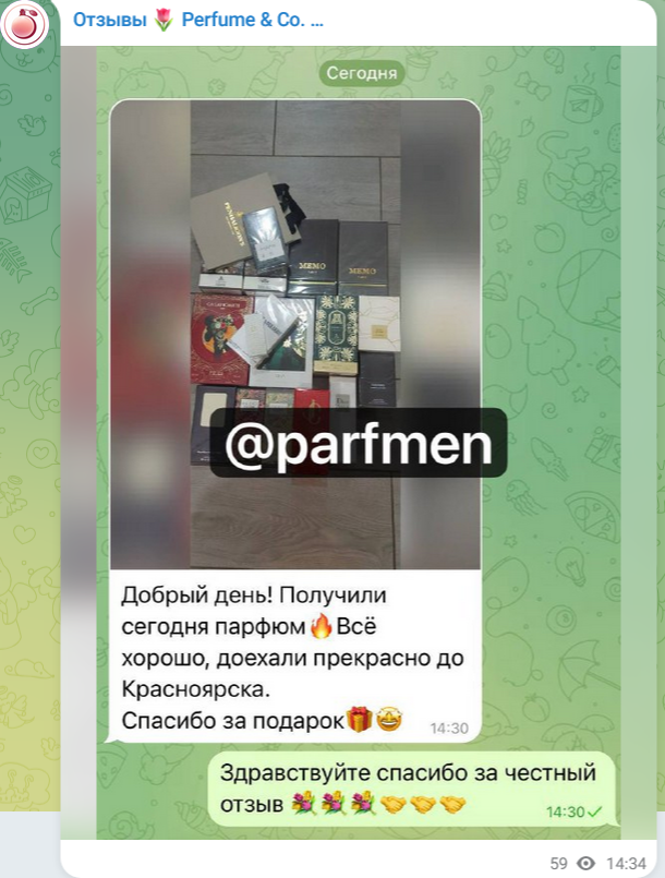 На основном канале комментарии оставлять нельзя, так же как и проставлять реакции. В тематической телеграмм-группе размещены только положительные отзывы о @parfmen. Покупатели благодарят за заказ, пишут, что товар доставлен без повреждений.