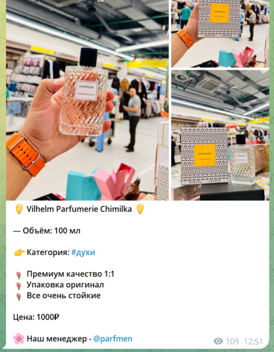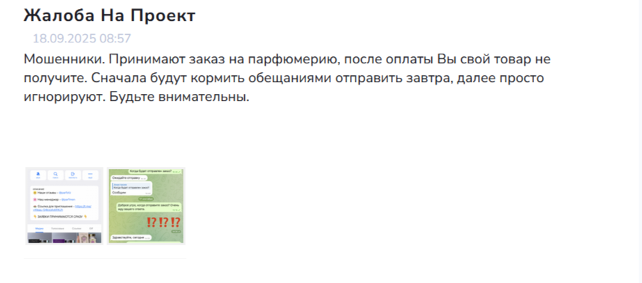 Мы не советуем покупать парфюмерию в анализируемом телеграмм-маркете, так как велик риск остаться без товара. Складывается впечатление, что админы принимают оплату, а заказ не отправляют.