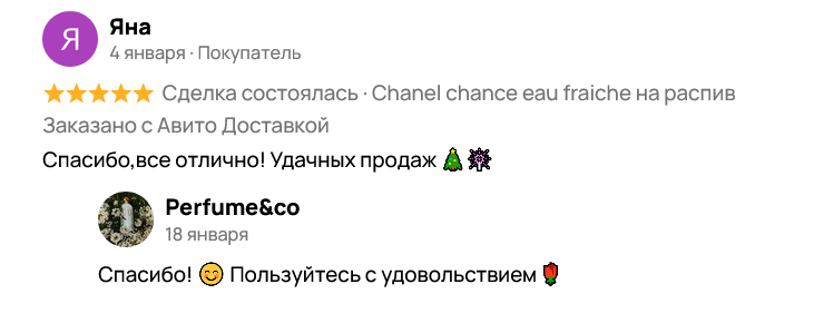 Также у онлайн-магазина есть аккаунт на Авито с 211 подписчиками, здесь объявлений о продаже духов нет, только отклики покупателей.