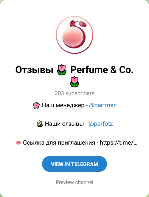 На канал в Телеграмм с отзывами о Perfume and Co с ником @parfotz в декабре 2025 года подписаны 203 человека, сообщество публичное.