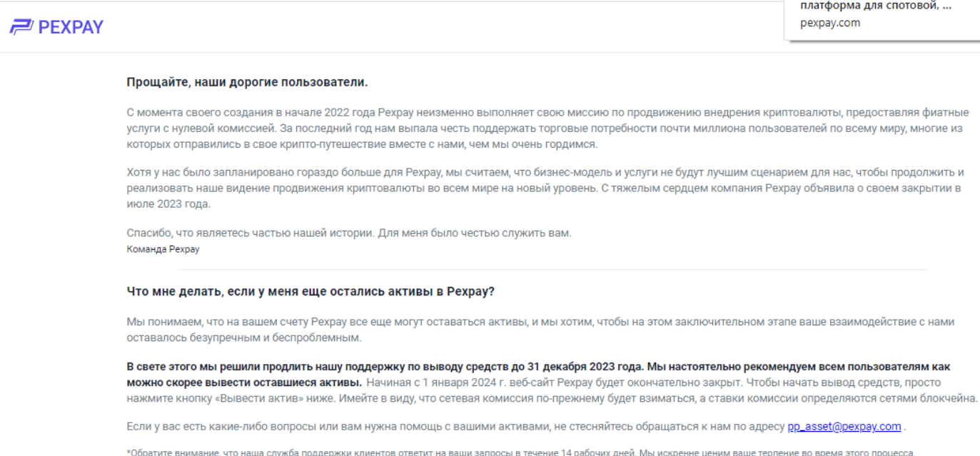 Мы проверили биржу «ПексПей» и выяснили, что раньше ее считали достойной, но по каким-то причинам владельцы не справились с управлением, поэтому решили закрыть площадку, а некоторые пользователи пишут, что вывести деньги так и не смогли.