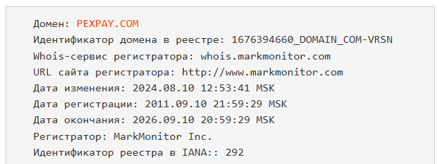 Создатели «Пекс Пей» утверждали, что работают с 2022 года, но уже спустя несколько месяцев закрылись, хотя на Whois ru указана дата регистрации домена 10.09.2011, то есть, имя часто переходило к новым владельцам.