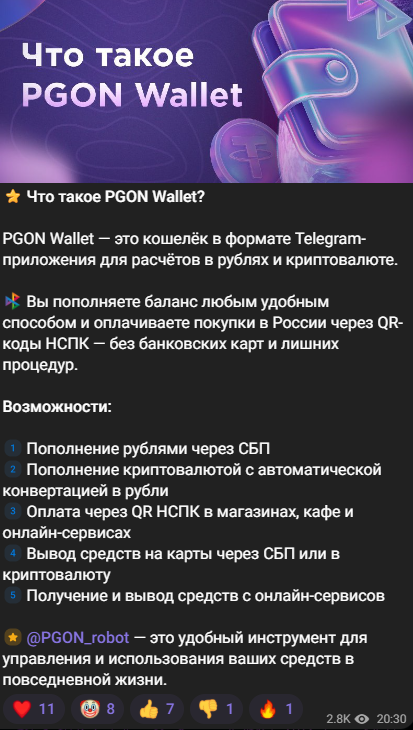 Pgon Wallet – это криптовалютный кошелек с возможностью оплаты в магазинах через QR, реализованный в мессенджере Тг. В обзоре проанализируем публикуемый на публичном канале контент, возможности торгового инструмента, а также отзывы реальных клиентов системы.