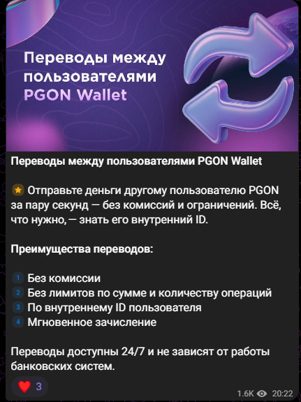 Следующий по счету пост рассказывает о переводах между пользователями. Деньги отправить другому можно якобы за пару секунд – без комиссий и других ограничений. Главное в работе с Pgon Wallet в Телеграмм – знать внутренний ID получателя. Лимиты по сумме и количеству операций не предусмотрены. Переводы доступны 24/7 и не зависят от работы банковских систем.