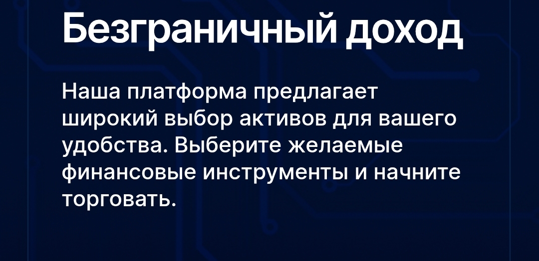 - Безграничный доход – владельцы проекта пишут, что их платформа предлагает широкий выбор активов для удобства пользователей. Юзеры могут выбрать желаемые финансовые инструменты и начать торговать.