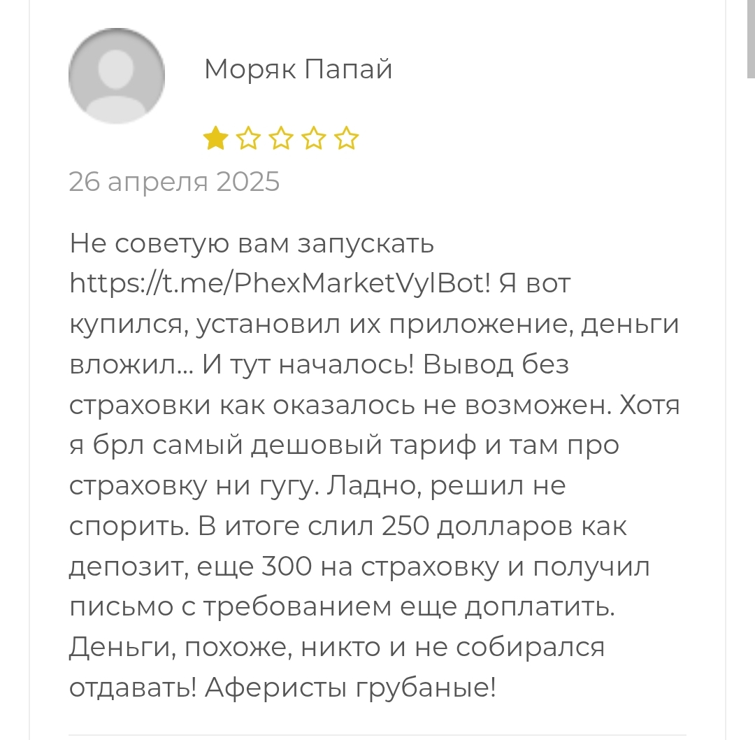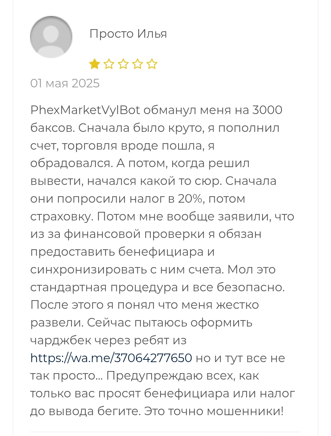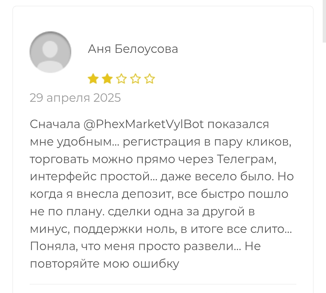 Мы не рекомендуем вам сотрудничать с брокером Phexmarketvylbot из-за анонимности создателей проекта, отсутствия регулирования и многочисленных негативных отзывов в интернете.