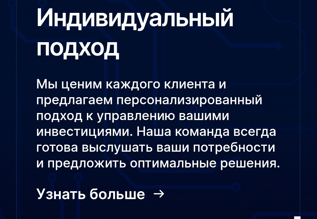 - Индивидуальный подход – компания предлагает персонализированный подход к управлению инвестиций пользователей. Авторы также утверждают, что из команда всегда готова выслушать потребности клиентов и предложить им оптимальные решения;