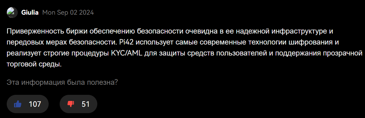 В сети есть немногочисленные и преимущественно позитивные отзывы о Pi42 com. Такие комментарии пользователей выглядят подозрительно, так как больше похожи на небольшие отзывы, где каждый пользователь старается отметить преимущества организации. Появление таких отзывов о бирже приходится по большей части на дату около последнего обновления домена.