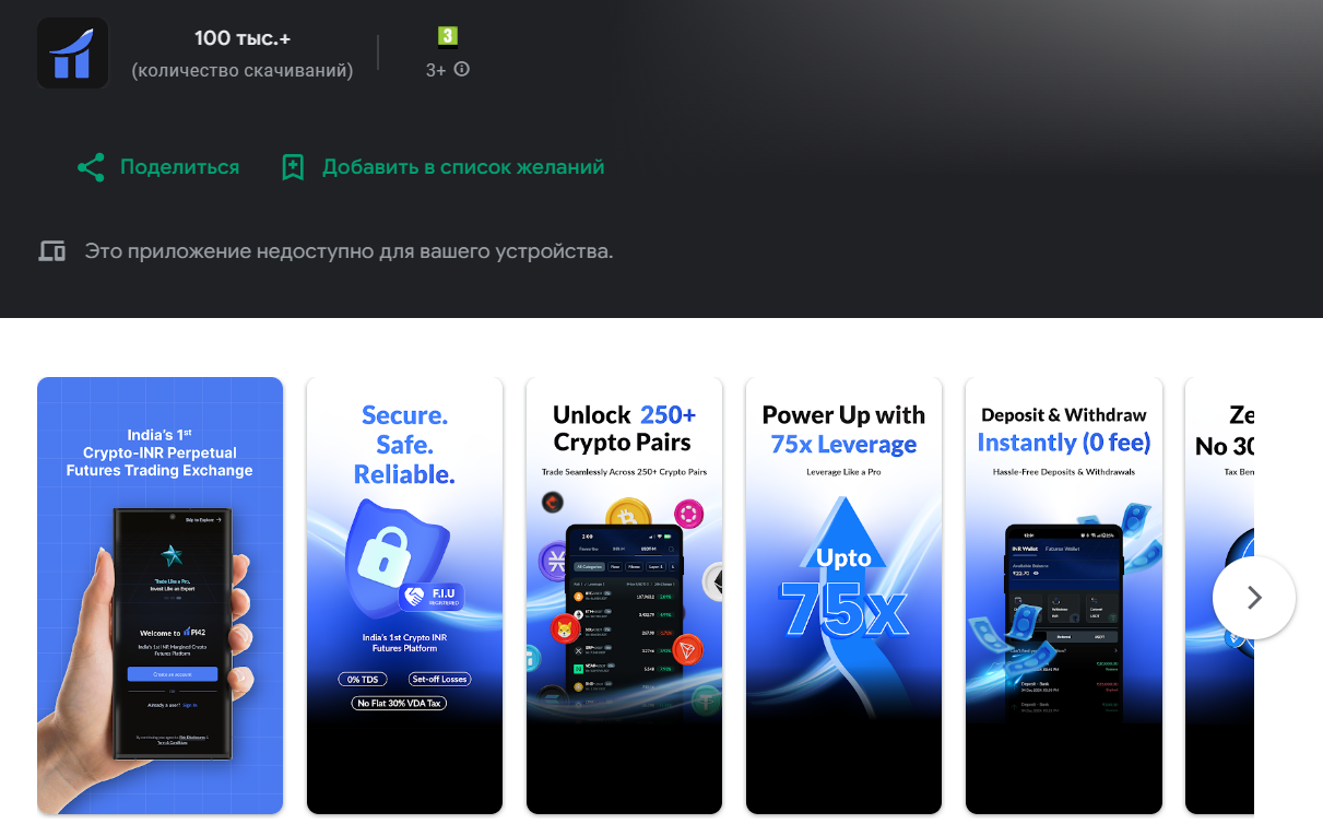 На официальном сайте Pi42 Exchange частично указаны торговые условия. Тут есть отдельные варианты для работы с долларами и рупиями. Для трейдеров обозначены комиссии за транзакции, а также прочие детали. У биржи есть несколько страниц в социальных сетях с несколькими тысячами подписчиков, к примеру, официальный канала в Телеграме Pi42 India s 1st INR Margin Crypto Futures Community. Ее приложение представлено в официальных магазинах гаджетов. Это показывает, что компания работает и поддерживает связь с клиентами.