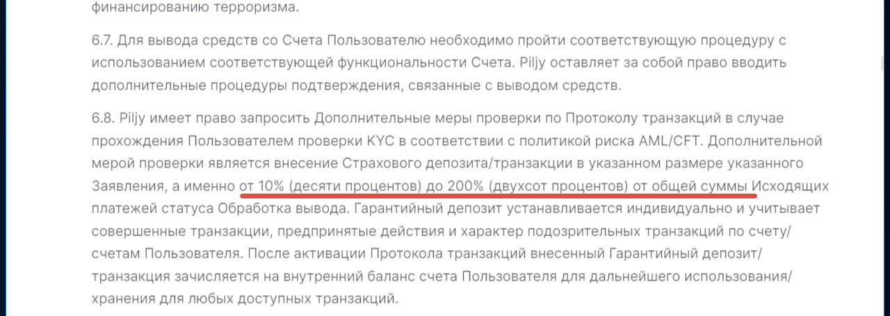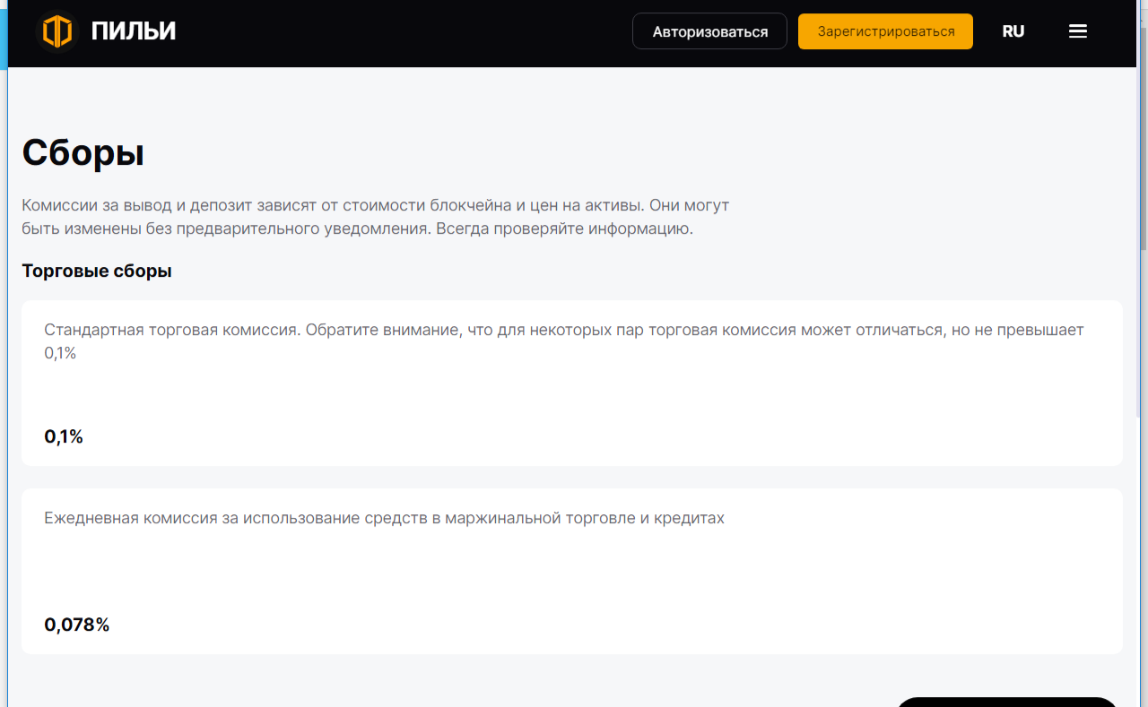 Отдельно брокер уточняет, что размеры комиссии могут меняться в зависимости от стоимости блокчейна и цен на активы. Вносить изменения Piljy может без предварительного уведомления клиентов.