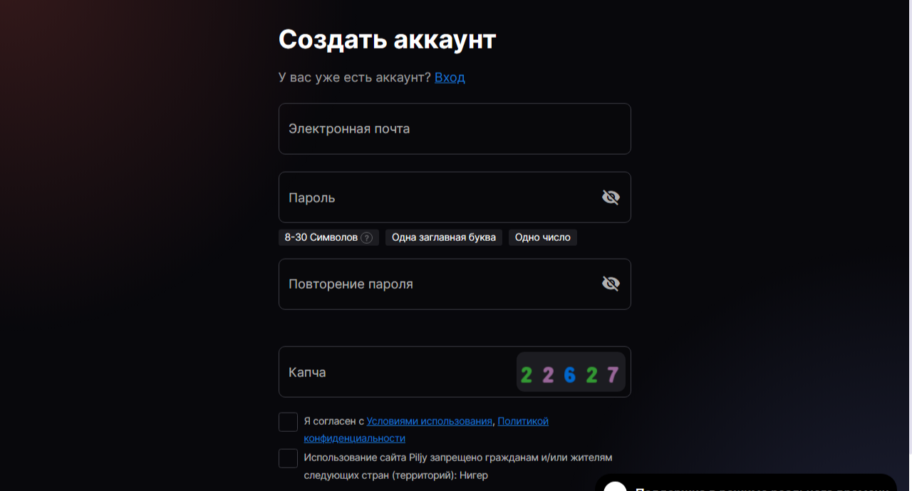 Русский язык на сайте не предусмотрен, что может вызвать затруднения у многих клиентов. Многие кнопки приводят на форму для регистрации. В основном такие вкладки содержат подробные финансовые условия. Это свидетельствует о том, что Piljy может утаивать важные сведения.