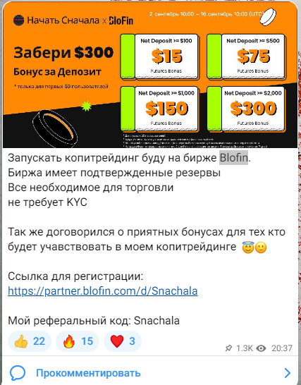 Максим не предлагает платных услуг — нет наставничества, VIP-доступа или управления капиталом. Все материалы канала бесплатны для подписчиков. Единственный источник дохода автора — реферальные ссылки на партнерские проекты. Например, Максим в своем телеграмм-канале «Пир Во Время Чумы» рекомендует биржу Blofin, которая не имеет лицензии и вызывает вопросы касательно безопасности.