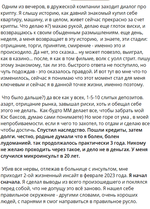 Согласно рассказам автора с ником MaksAgain, путь в криптовалюту начался с истории успешного знакомого, который смог приобрести жилье и автомобиль благодаря торговле. Это восхитило Максима, поэтому он сам решился заняться таким делом, однако вскоре прогорел. Переломным моментом стало заболевание — инсульт — после которого трейдер переосмыслил всю свою жизнь и решил начать сначала, используя базовые методы анализа.