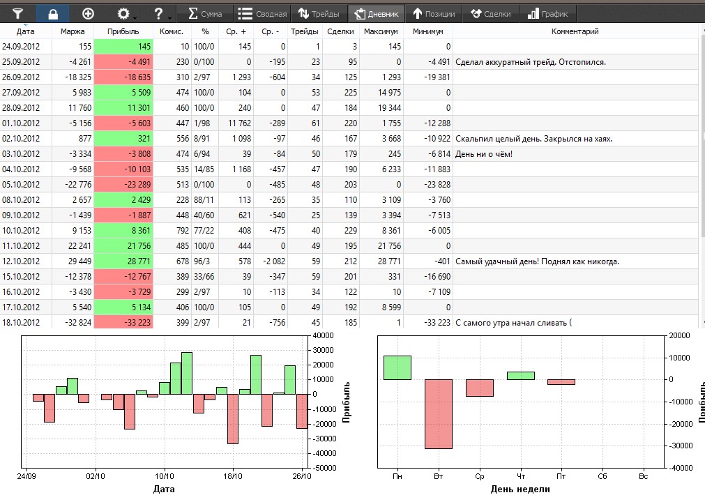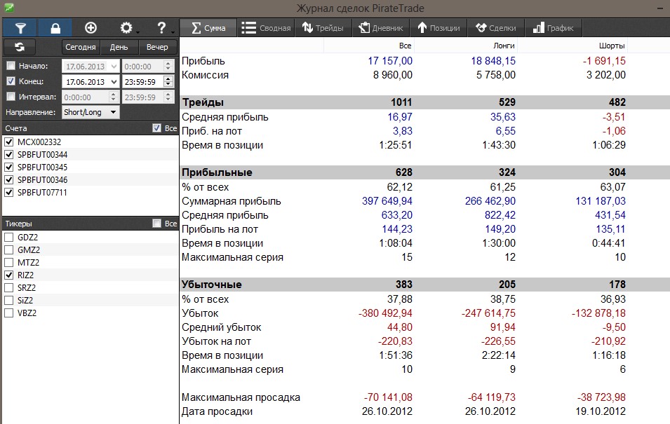 Дневник Pirate Trade позволяет заносить сделки вручную или загружать отчеты из Quik или от брокера. Софт позволяет подсчитывать доходность, процент прибыльных сделок, вычислять среднюю прибыль и убыток и выводить другие показатели.