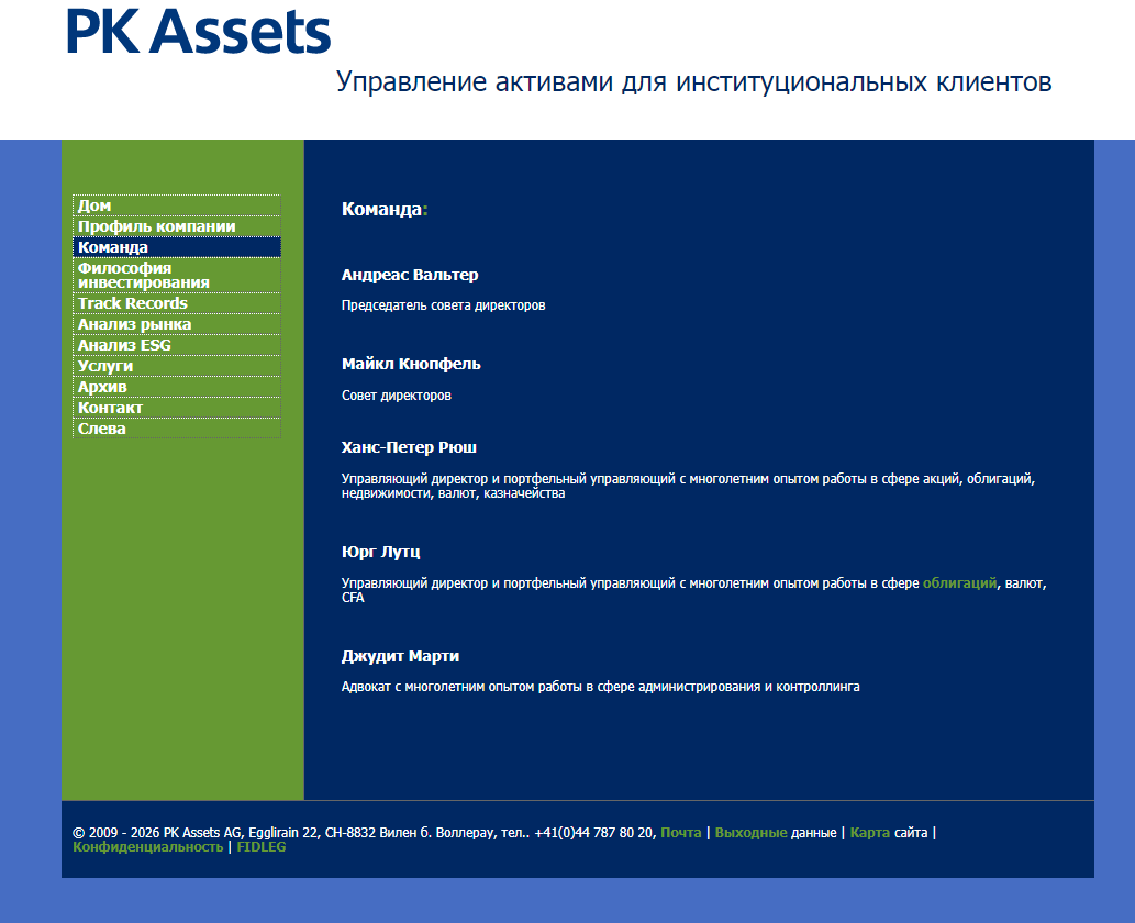 Официальный сайт компании локализован только для германоязычных пользователей, перевода на русский, английский или другие языки нет. Проверка регистрации домена PK Assets ag показала, что ресурс был зарегистрирован в 2007 году.