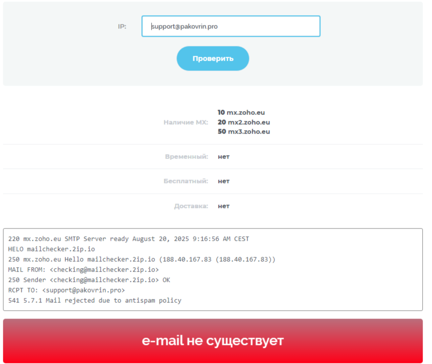 На просторах интернета мы нашли электронную почту support@pakovrin.pro, где можно получить помощь от менеджеров. Также ранее мы писали, что при входе доступна форма для отправки обращения. Мы решили проверить состояние почтового адреса и оказалось, что он фальшивый.