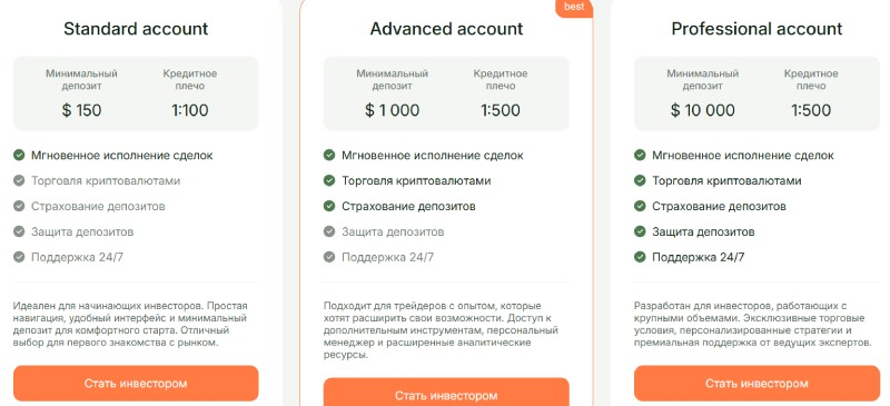 Для первого тарифа доступно только мгновенное исполнение сделок. Во втором тарифе к этому пункту добавляется торговля криптой и страхование депозитов. В третьем – все ранее перечисленное, плюс, защита депозитов и круглосуточная поддержка.