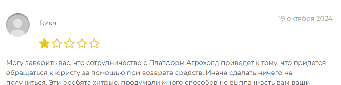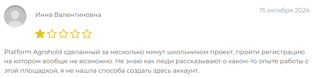 Наиболее информативным для всего найденного материала были отзывы о platform agrohold net. Наибольший интерес вызывает то, что многие отмечают проблемы с первой страницей сайта. Тут присутствует нетипичный дизайн для данной сферы, нет важных элементов, платежной информации, данных для обращения в поддержку и т.п. Это действительно похоже на однодневный сайт-визитку или учебную работу студента, который создает сайты.