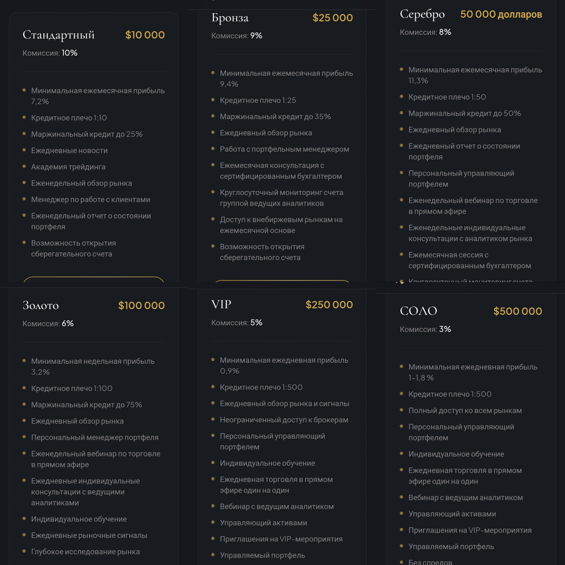 - “Золото”. Пополнение счета от 100 тыс. долларов, комиссия 6%. Недельная прибыль 3.2%, плечо 1 к 100, есть управляемый портфель, ВИП-консультант;