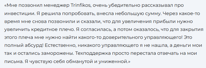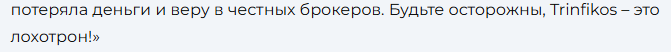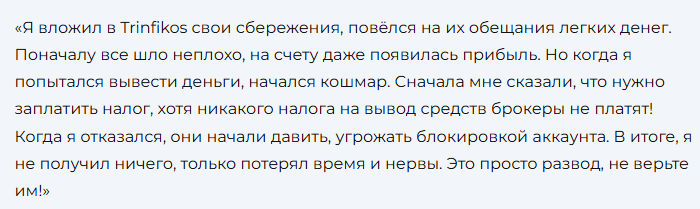 Если изучить отзывы о TrinFikos com, то можно найти множество негативных комментариев о том что это развод. Сообщается, что после прибыли и попыток вывести средства со счета требуют оплатить налоги, о которых ранее ничего не упоминалось. После следуют угрозы блокировки аккаунта клиента.