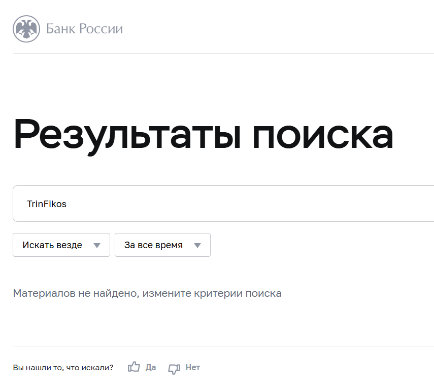 TrinFikos заявляет о своей регистрации в США, но найти никаких лицензий на имя такой компании в реестрах американских регуляторов нельзя. На сайте центрального банка Америки нет никакой информации о подобной компании.