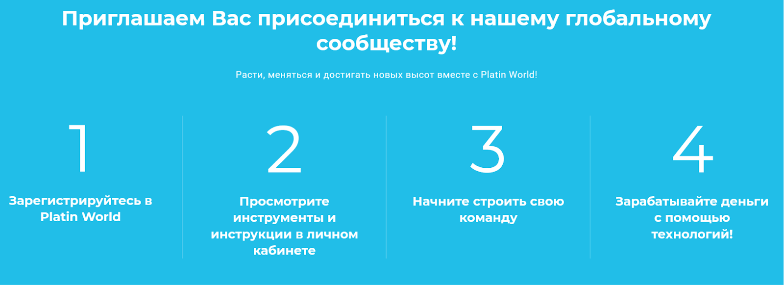 На сайте заявлено, что для получения прибыли необходимо сделать всего 4 шага. После создания аккаунта на Platin World com нужно пополнить баланс и начать собирать собственную команду, то есть приводить друзей по ссылке реферала.