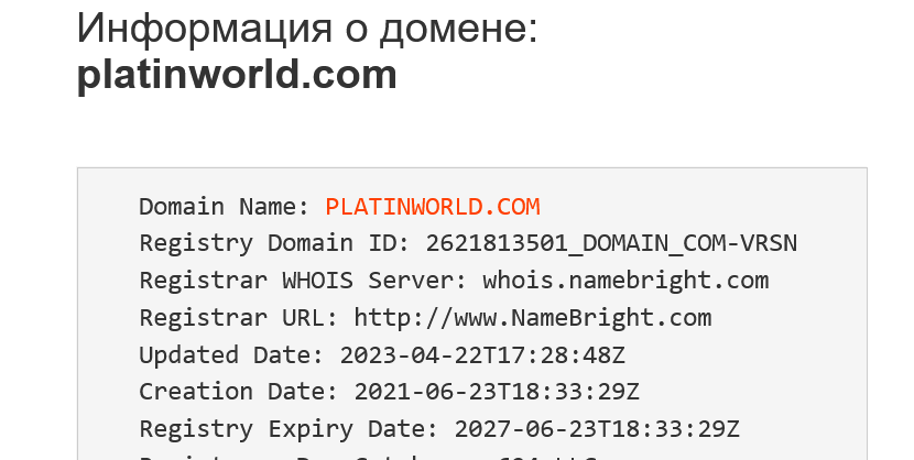 По данным Whios, сайт «ПлатинВорлд» зарегистрирован в 2021 году, а в 2023 году обновлен.