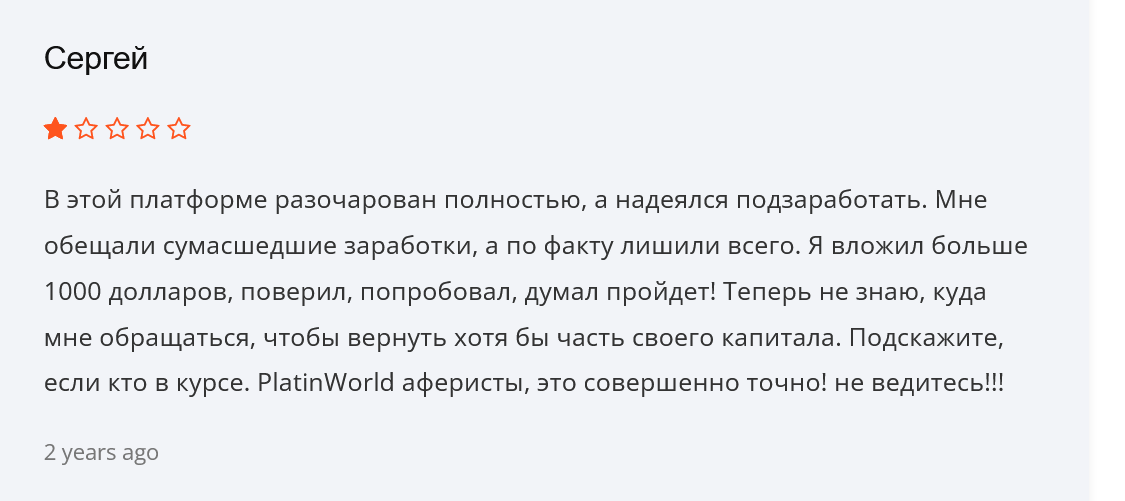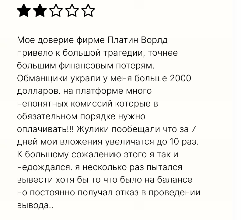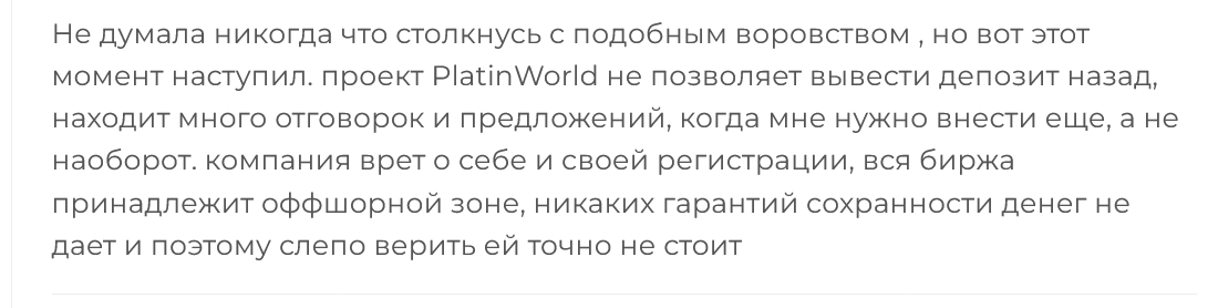 Ни о какой безопасности или сохранности денег не может быть и речи — так считают пользователи, которые столкнулись с разводом на деньги со стороны Platin World .