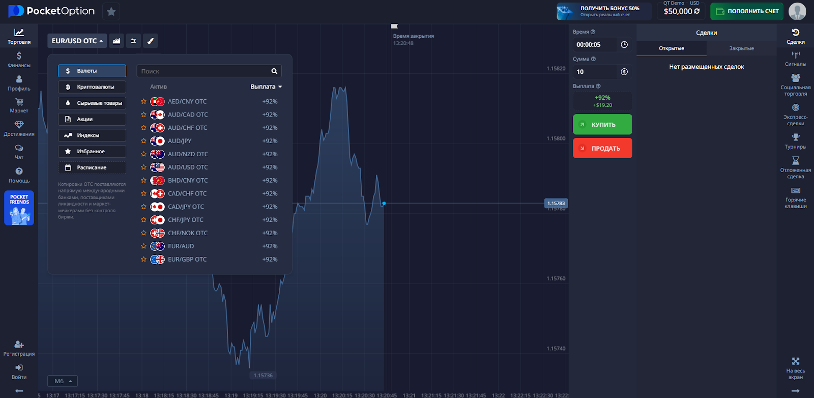 Предусмотрена возможность открывать короткие сделки от нескольких секунд, а также размещать многочасовые ордеры. Для технического анализа есть свечи, графики и базовые индикаторы.