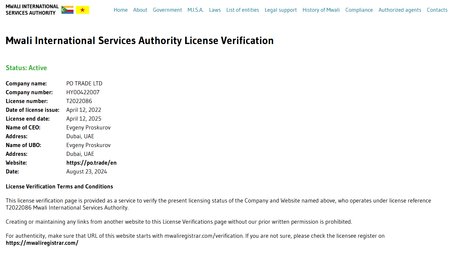 У Infinite Trade LLC нет отдельной лицензии для работы на разных рынках, но у PO Trade есть разрешение от MISA, регулируется законами острова Мвали.Мы проверили сведения, нашли выписку из официального реестра, где указано, что компания находится в Дубае. Генеральным директором PO Trade LTD является некий Евгений Проскуров.