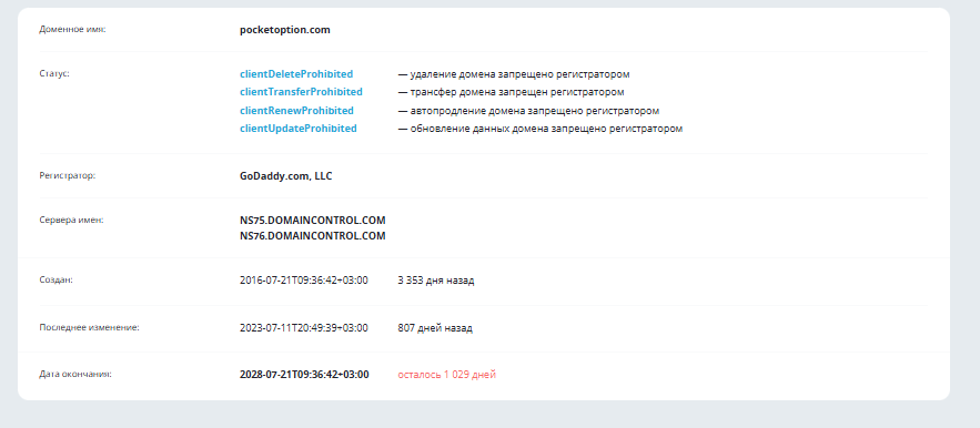 Домен pocketoption com зарегистрировали летом 2016 года, последние изменения были в 2023 году.