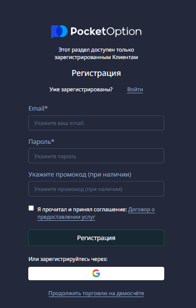 Чтобы начать трейдинг на Po Spd, необходимо зарегистрировать аккаунт. Понадобится указать адрес почты, затем подтвердить его кодом из сообщения. Также система позволяет авторизоваться через специальную форму Google.