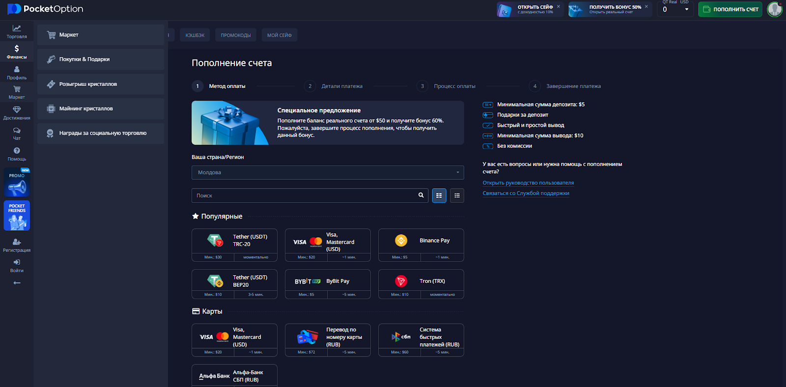 Брокер предусматривает разные механизмы внесения средств на счет. Можно перевести деньги с карты, в криптовалюте, а также через электронные кошельки.