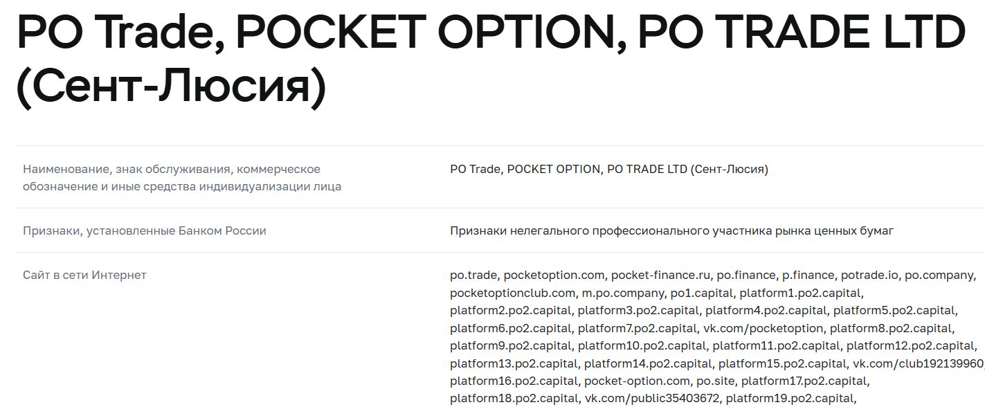 Этот сайт полностью копирует стандартный сайт PO. Деятельность проекта обеспечивается фирмой Infinite Trade LLC, которая зарегистрирована в Коста-Рике. Доступа к сведениям о наличии лицензий и информации о регуляторах, в юрисдикции которых работает проект, нет. Сайт заблокирован на территории РФ. Он попал в перечень связанных с Pocket Option проектов. Так как компания не имеет разрешения вести деятельность на территории России, соответственно и блокировка вполне законная: