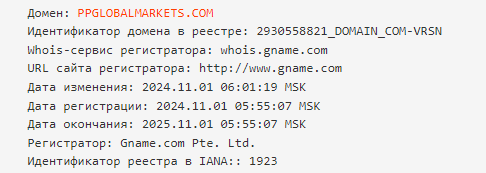 Мы решили проверить официальный сайт компании Ppglobalmarkerts com, так как предлагаемый дизайн является довольно шаблонным для брокера такого уровня. Домен был зарегистрирован в ноябре 2024 года, что никак не связывается с датой основания.