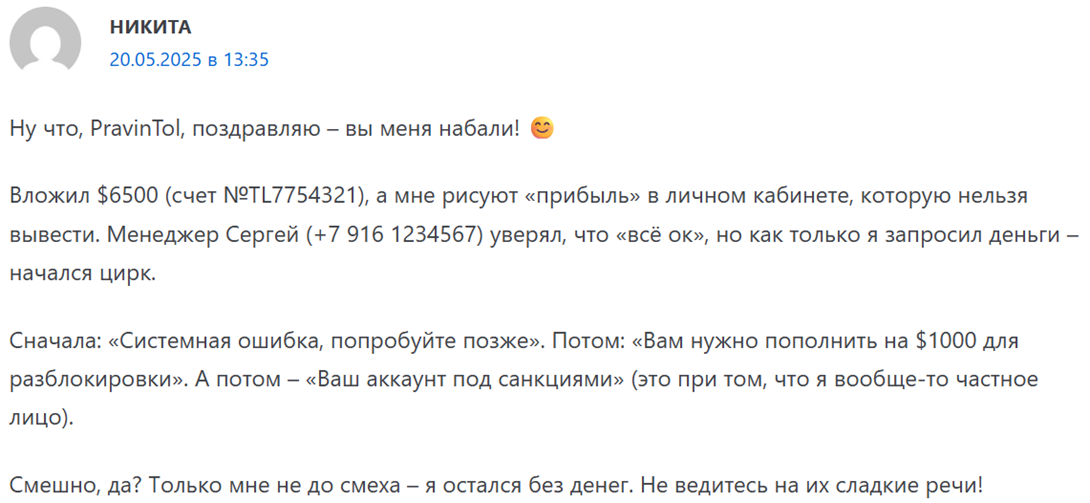 В сети можно встретить немало отзывов о брокере Pravintol на различных специализированных платформах. Тут собраны преимущественно негативные отклики. Люди сталкиваются с проблемами, характерными для скам-сайтов. Менеджеры уговаривают пополнить депозит и постепенно его увеличивать, так как аккаунт работает с прибылью. Вне зависимости от того, соглашается человек или нет, рано или поздно наступает момент необходимости вывода. Здесь практически все отзывы о Pravintol сводятся к тому, что получить деньги назад невозможно. Запросы на вывод удаляются, а со временем блокируется и сам аккаунт.