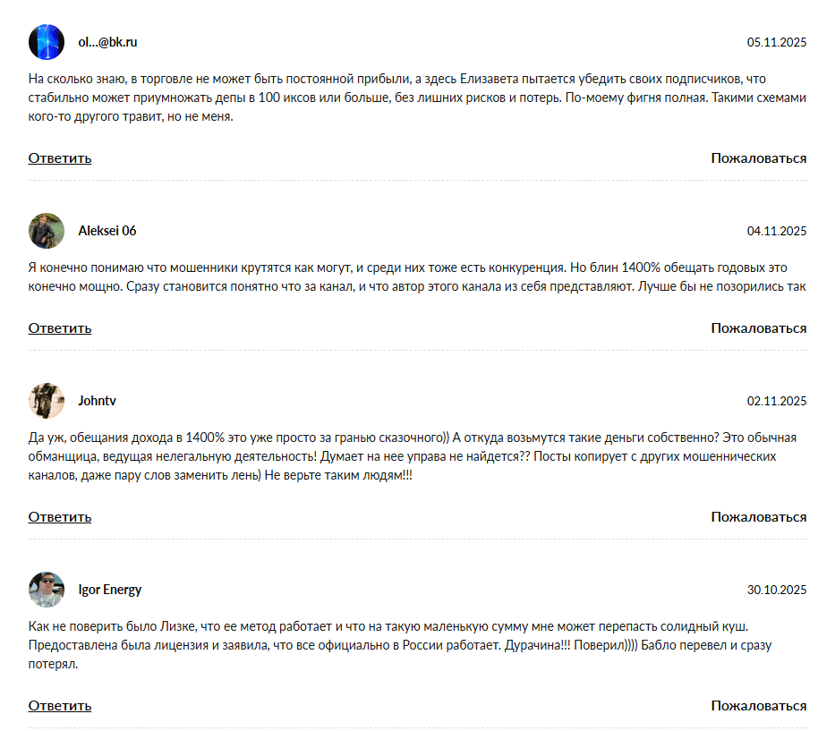 Деятельница якобы является опытным инвестором. Заявляет, что начала торговать с 2018 года. Елизавета обладает уникальной стратегией торговли, имеет почти тысячу успешных кейсов и помогает клиентам достигать высокой прибыли.