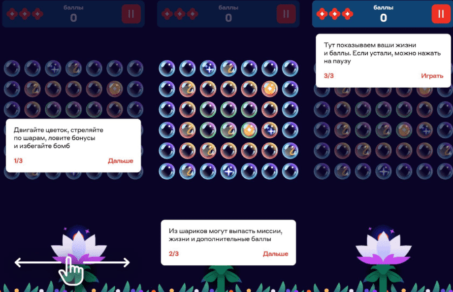 Подсказки и какие призы ловить в игре «Прицельные инвестиции альфа», указывается в приложении. Там же будут доступны новые задачи. Ваш основной игрок является лотосом. Вы управляете им по полю и можете стрелять по шарикам. Нужно избегать падения бомб, чтобы успеть собрать как можно больше очков. Начисляемые жизни в конце дня не сгорают, поэтому пропущенный день не является утратой потенциала, полученные жизни можно использовать в следующий раз. Главное израсходовать все до последнего дня игры.