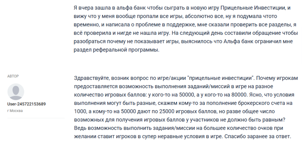 В сети об игре «Прицельные инвестиции Альфа» отзывы встречаются на проверенных ресурсах. Так как это официальная игра, то люди больше стараются разобраться в особенностях, правилах и наиболее ценных призах. Некоторые удивляются, почему им отказали в доступе. Другие люди не разобрались с бонусной системой и уточняют интересующие их вопросы в комментариях. Отсутствуют отзывы об игре «Прицельные инвестиции», что это скам. Большинство людей доверяет компании.