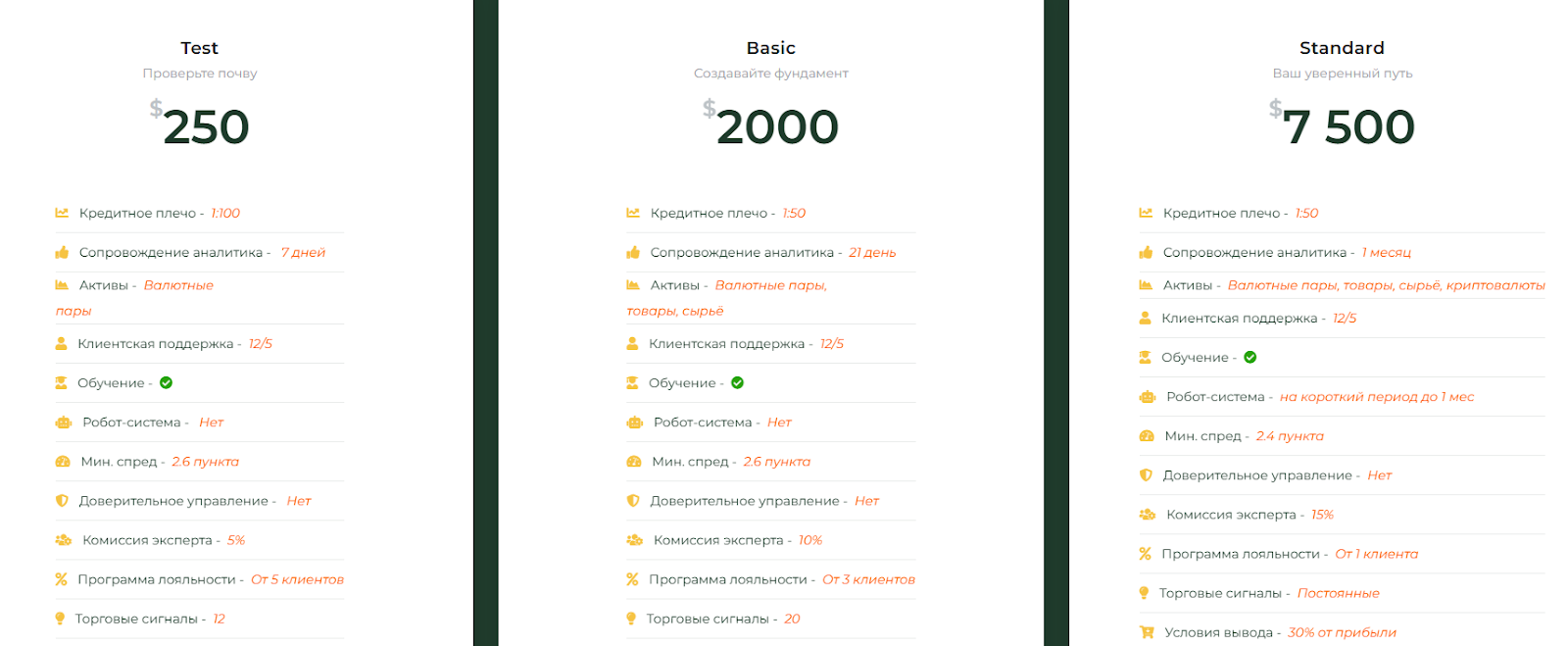 - В Standart нужно вложить от $7500, плечо составляет 1:50, к активам добавлены криптовалюты. Аналитик сопровождает клиента в течение месяца. Минимальный спред – 2,4 пункта. Клиент получает доступ к роботизированной системе торгов.