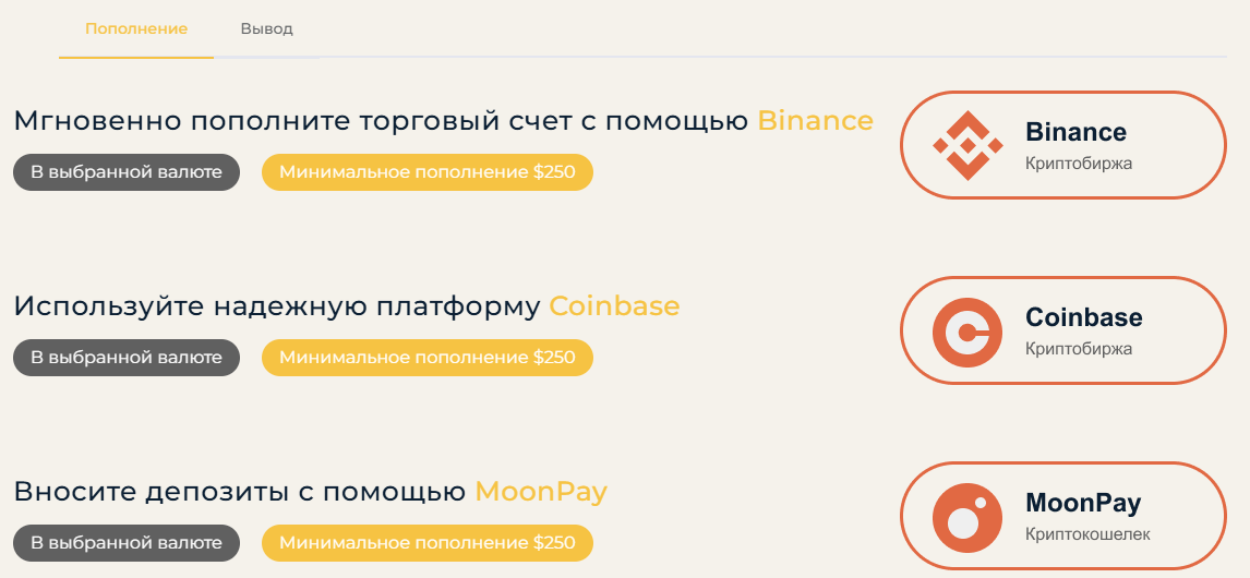 Варианты пополнения и вывода средств