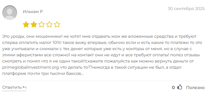 Положительных отзывов от пользователей, которые реально смогли вывести деньги с Prime Global Investment, в интернете нет.