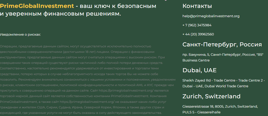 Prime Global Investment – это международный брокер, который зарегистрирован в оффшоре. На сайте primeglobalinvestment org указано, что у брокера есть офисы в Санкт-Петербурге, Дубае и Цюрихе, но точные адреса не публикуются. Перечень активов стандартный, но отсутствует хотя бы минимальная информация о торговом терминале.