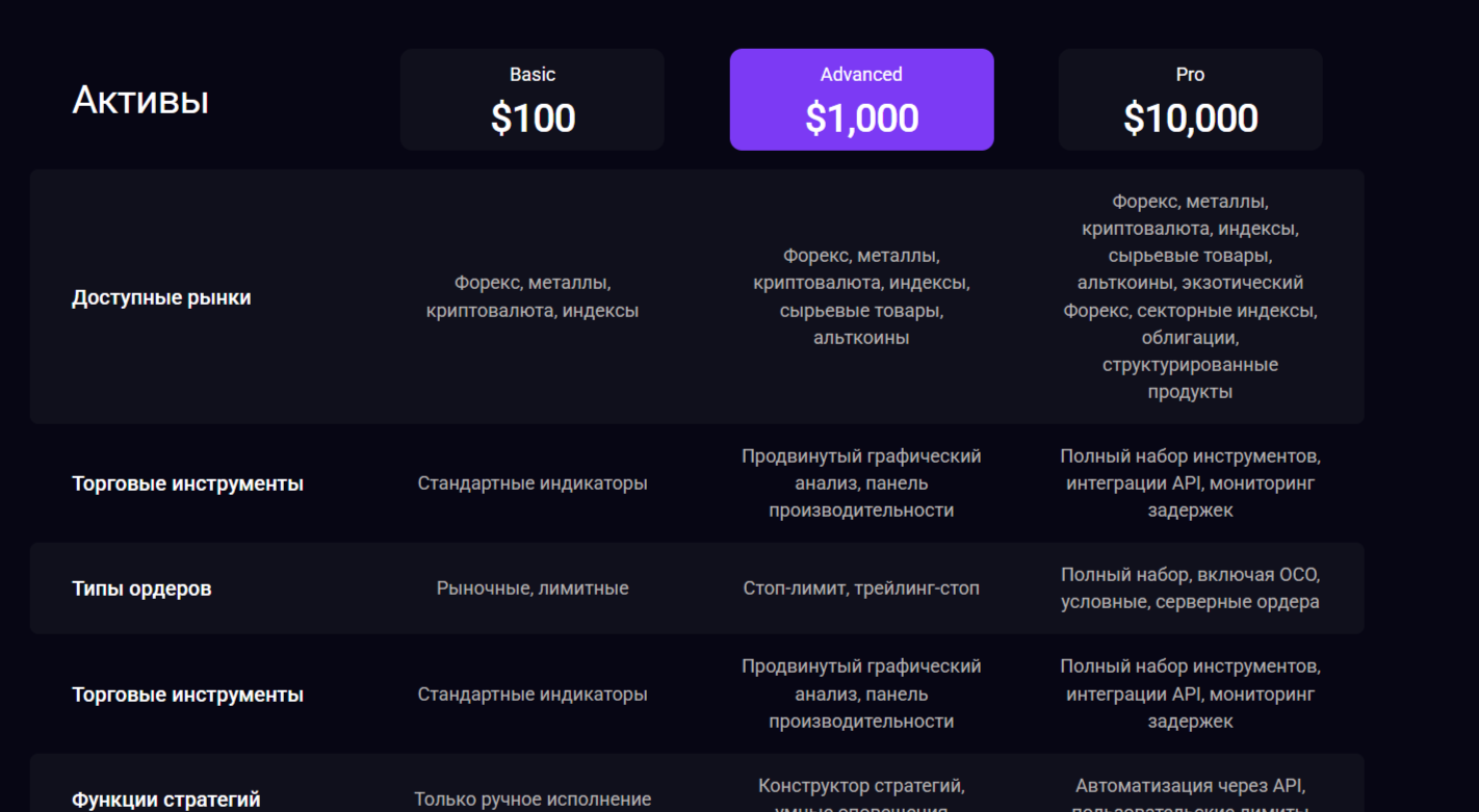 - Advanced. Платеж от 1 000 долларов, продвинутый графический анализ, стоп-лимит и трейлинг-стоп, конструктор стратегий.