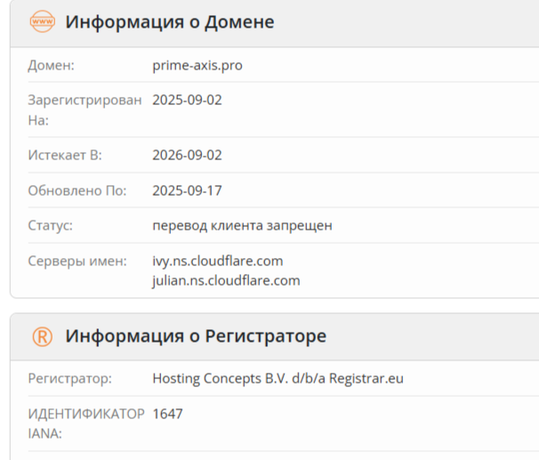 В процессе обследования веб-сайта prime axis pro получены следующие данные. Рассказ о работе брокера PrimeAxis Capital с 2010 года является фейковым. Домен посредника был зарегистрирован 02 сентября 2025 года. На момент обзора «надежной» брокерской организации исполнилось 6+ месяцев. Данная компания не числится в реестрах юрлиц и известных юрисдикций, не сотрудничает с ЦБ РФ. Перечисленные факты говорят о неком разводе.