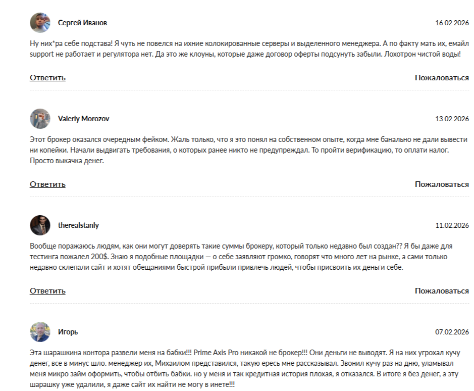 На сторонних веб-сайтах нет позитивных комментариев о работе фейкового посредника PrimeAxis Capital. Здесь преобладает негатив. В отрицательных отзывах упоминаются мошенничество и обман, блокировки клиентских аккаунтов и присвоение денег трейдеров.