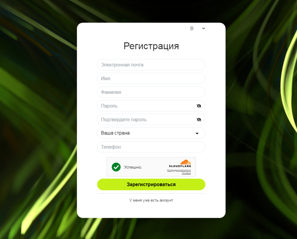 Все, что доступно трейдерам – это окно для входа и регистрации. Так, для создания личного кабинета пользователь должен ввести свою почту, имя, фамилию, пароль в двух строках, телефон и выбрать страну проживания.