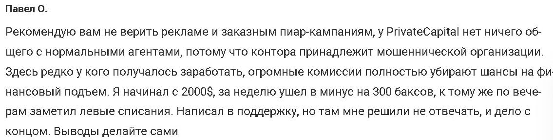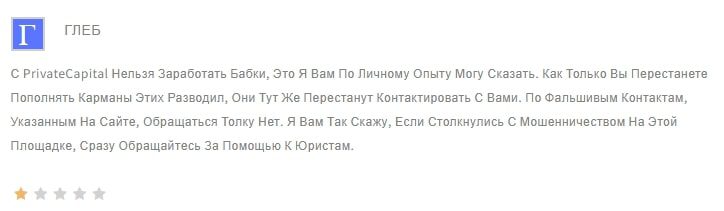 За полгода, которые успел проработать брокер, он развел немало людей. Они оставили о Private Capital много негативных отзывов на тематических сайтах. Подтверждают схему с разводом на депозит и отказом выводить средства.