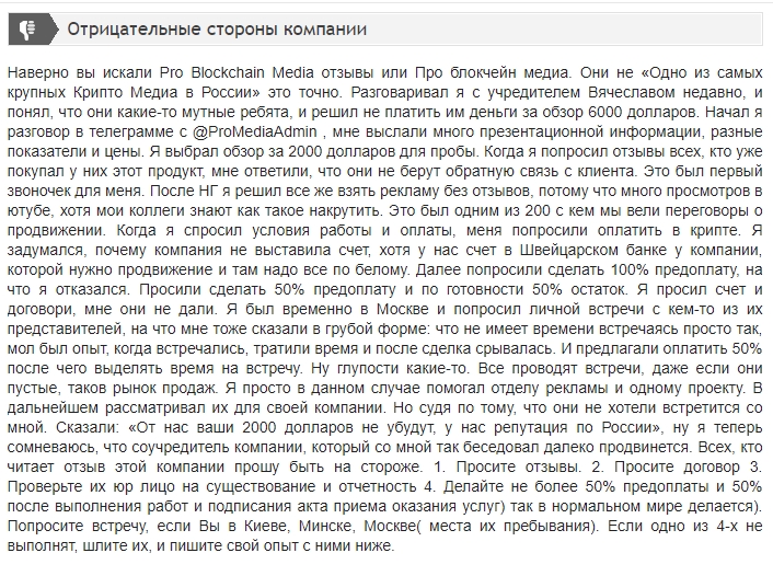 Отзывов о про блокчейн медиа мало, однако если вы подумываете заказать раскрутку у ProMediaAdmin, то стоит почитать следующий отклик пользователя, который передумал пользоваться услугами, узнав о предоплате в 50% и отсутствии каких-либо чеков и договоров. Какая серьёзная организация так работает?