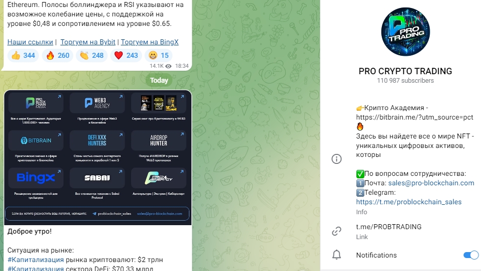 Компания про блокчейн имеет широкий спектр услуг, в которые входят обучение торговле на рынке, раскрутка сервисов, доступ в закрытый клуб, где можно пообщаться с экспертами-инвесторами. Можно ли доверять данным услугам? Начнём с канал в Телеграм PRO CRYPTO TRADING – на нём более 110 тыс. подписчиков, но посты просматривают в среднем 12 тыс. человек – аудитория накручена почти в десять раз. Канал был создан в 2020-м году и на момент обзора существует уже более четырёх лет.